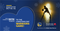During October, Stanford Blood Center donors will be automatically entered into a drawing for four tickets to the Warriors vs. Dallas Mavericks game on Christmas Day. The matchup will take place Thursday, December 25, at 2:00 p.m. at Chase Center in San Francisco. Click here for more information.